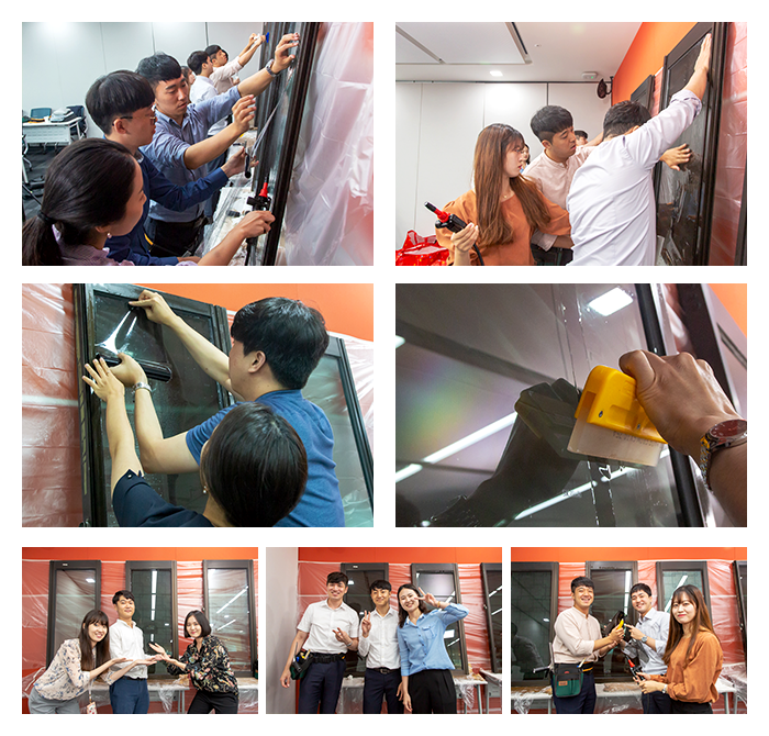 완벽한 시공을 위해 직접 필름을 붙여보는 시공교육도 함께 받았습니다. 시공 교육은 본사 6층에서 상반기 신입사원 15명이 참석한 가운데, 세이브에너지 이상기 대표가 강사로 나서 진행됐습니다.