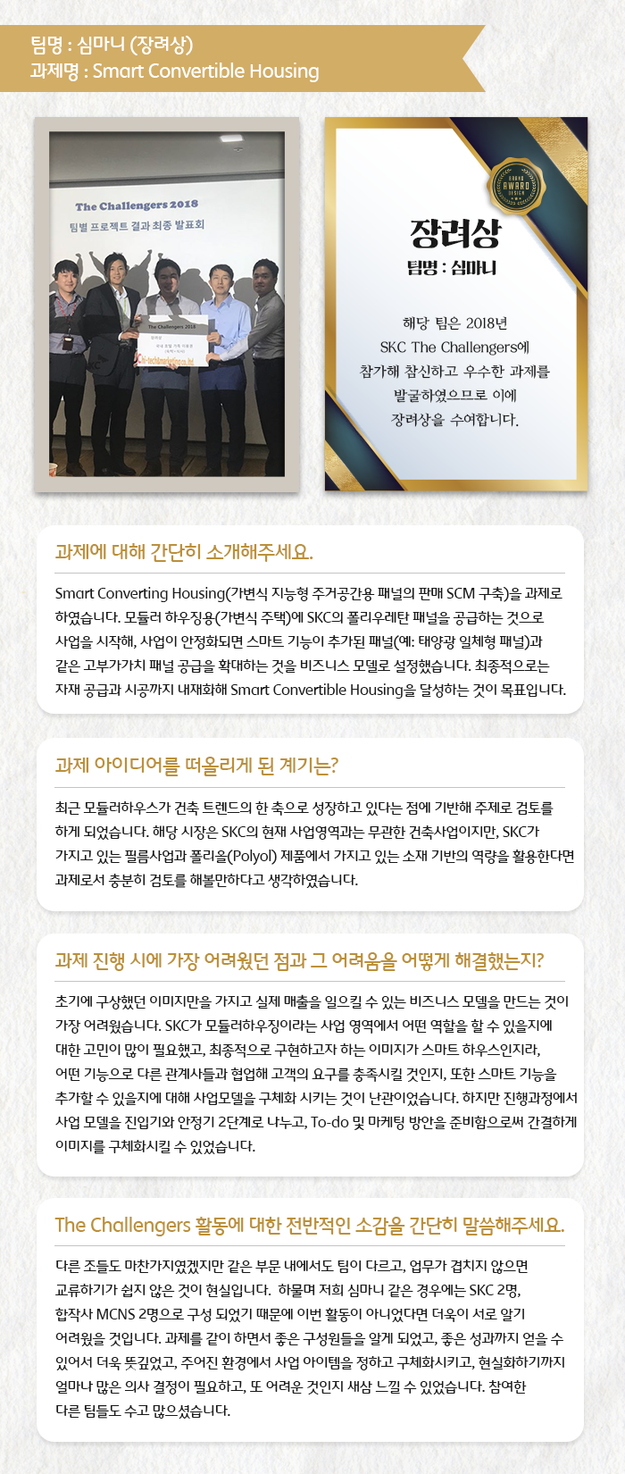 지난 5월부터 화학사업부문에서 매년 진행하는 'SKC The Challengers 2018'이 열렸습니다. ‘SKC The Challengers 2018’는 개인이 아닌 원 컴퍼니 차원에서 사업부문을 넘나드는 신 사업 아이디어를 발굴하는 것으로 업그레이드 되었습니다. 이번 프로그램은 본사 주니어 구성원 46명을 킥오프 당일 조추첨을 통해 화학 사업과 인더스트리 소재 사업에서 각 2명씩 4인 1조로 구성된 팀으로 조를 나눠 하나의 프로젝트를 이끌었는데요. 드디어 올해 SKC The Challengers의 수상 팀이 공개되었습니다. 과연 올해 입상한 영광스러운 팀은 어느 팀일까요? 수상 팀의 인터뷰를 직접 담아왔습니다.