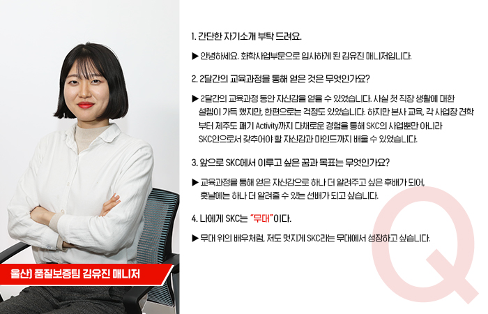 약 6주간 자사연수를 받았는데요. 2달간의 교육과정을 통해 SKC Value에 대한 확신을 기르고 패기를 실천하며 ‘Global Specialty