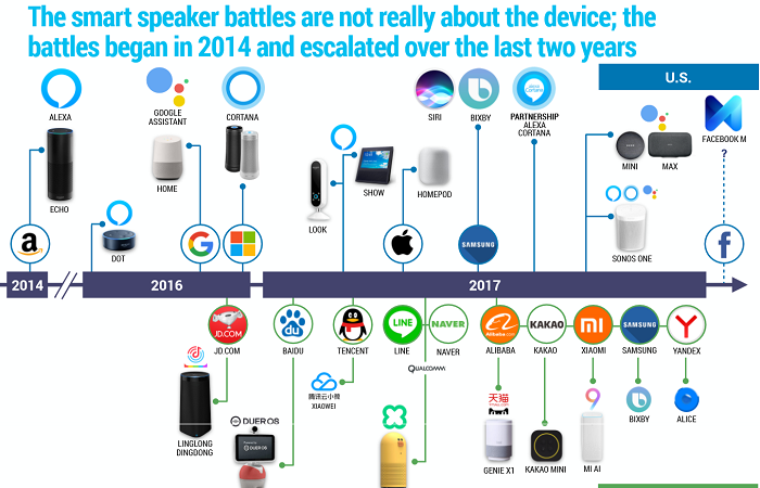 따르면 2017년 스마트 스피커 판매는 130% 정도 증가했다. 2018년은 아마존이 시장 점유율 70% 정도 장악하는 가운데 '킬러앱'이 나올 것으로 예상된다.